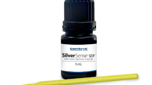SilverSense SDF is a blue-tinted 38% silver diamine fluoride (SDF) solution that is cleared by the United States Food and Drug Administration as a professional-use tooth desensitizer. SDF has been used internationally for decades due to its antimicrobial and desensitizing properties. As a desensitizer, SilverSense SDF forms insoluble precipitates with calcium or phosphate in the dentinal tubules to block nerve impulses. SilverSense SDF will become a standard part of the preventive-restorative armamentarium as it alleviates hypersensitivity and allows patients to comfortably wait for restorative treatment.