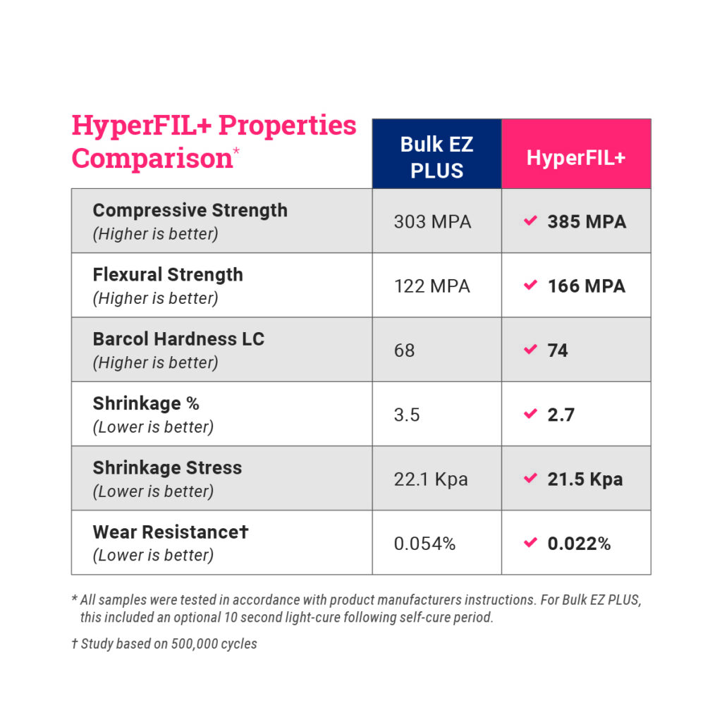 HyperFIL+ outperforms the market leader, Bulk EZ PLUS in all key property comparisons, including compressive strength, flexural strength, barcol hardness LC, shrinkage percentage, shrinkage stress, and wear resistance. HyperFIL+’s compressive strength is 385 MPA vs. Bulk EZ PLUS’ at 303 MPA and its flexural strength is 166 MPA vs. Bulk EZ PLUS’ at 122 MPA. An in-depth data chart is available upon request.