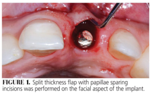 A complex soft tissue defect around a maxillary implant was successfully treated using a modified coronally advanced tunnel technique with a connective tissue graft. By combining precise surgical and prosthetic protocols, clinicians achieved optimal tissue stability and a natural emergence profile, fulfilling the patient’s esthetic goals.