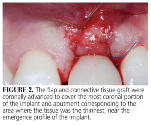 Surgical Protocol. The soft tissue defect was treated with a modified coronally advanced tunnel technique including a connective tissue graft (CTG) harvested from the tuberosity. Following local anesthesia, a poach was created with a modified orban knife on the facial aspect of the implant abutment, preserving the interdental papillae. The flap was raised in a split thickness approach in a coronal apical direction to permit the coronal displacement. Careful dissection was performed to avoid thinning of the buccal flap (Figure 1). The connective tissue was harvested from the tuberosity via a table-top technique and inserted into the pouch. The graft and the flap were stabilized with sling sutures around the cingulum of the temporary crown (Figure 2).