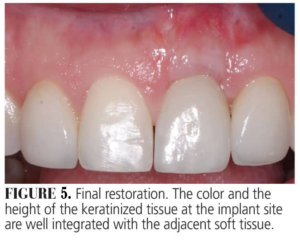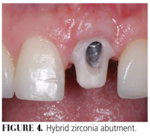 Prosthetic Protocol. Five months after the surgery, the patient underwent orthodontic treatment on the maxillary arch only, which lasted for 6 months. The healed surgical site soft tissue was consistent in color and texture with the surrounding area (Figure 3). After completion of the orthodontic treatment, the original abutment was scanned and new hybrid zirconia coping was made to fit over it, transforming it to a hybrid abutment (Figure 4).