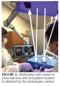 Navigation systems for oral and maxillofacial surgery are mainly based on optical tracking technology. The patient will have devices attached to his/​her jaw and on the handpiece used during surgery. These devices will have light-emitting diodes or passive reflecting tracking elements that are tracked by the stereoscopic optical camera and guided by the preplanned implant position on the CBCT. The accuracy of these optical tracking systems usually lies between 0.1 and 0.4 mm (Figure 1).11,12