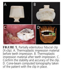 In partially edentulous patients, an impression of the teeth is taken by a fiducial marker (Figure 1A). To take that impression, the fiducial clip (X-clip) is placed in a hot water bath at a temperature of 140° to 160 °F for 3 to 5 minutes until the thermoplastic material is clear and then an impression is taken on the opposite side of the same arch that the implant is to be placed, as to not interfere with the drilling of the implants (Figure 1B).
