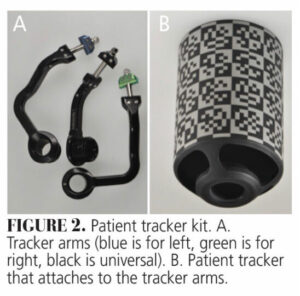 Once an impression is taken, the fiducial is removed and placed in cold water; it is then tried on again in the patient’s mouth to confirm stability and accuracy. The clinician must ensure that whenever the fiducial is taken out, it is placed back into the same location in the patient’s mouth to ensure registration is accurate (Figure 1C). Once the fiducial is confirmed to be stable in the patient’s mouth, the clinician then takes a CBCT of that jaw with the fiducial marker in place (Figure 1D). The fiducial marker has an area to which the tracker arms and the patient tracker attach. This allows for live tracking during the surgery of the patient’s anatomy as displayed in the CBCT (Figure 2).
