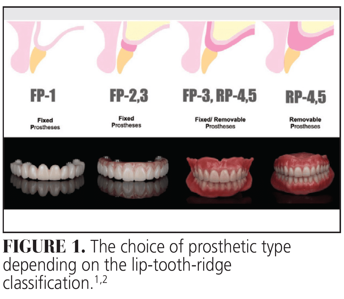 The choice of prosthesis is tailored to each patient’s unique anatomy, including factors such as the ideal size and position of the maxillary central incisor, upper lip dynamics, facial support, the shape of the edentulous ridge (lip-tooth-ridge classification), required prosthetic volume, and the patient’s preferences (Figure 1).1,2