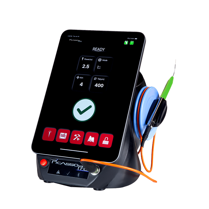 The Picasso Pro diode laser platform provides clinicians with a versatile tool for multiple dental procedures, including soft tissue surgery and management, laser assisted pain alleviation (LAPA™) for painless injection, photobiomodulation (PBM) therapy, endodontic applications including LEAP, and future laser induced reversible adhesive (LIRA™).
