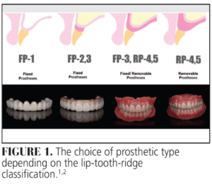 The choice of prosthesis is tailored to each patient’s unique anatomy, including factors such as the ideal size and position of the maxillary central incisor, upper lip dynamics, facial support, the shape of the edentulous ridge (lip-tooth-ridge classification), required prosthetic volume, and the patient’s preferences (Figure 1).1,2