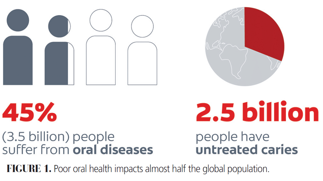 Almost half of the world’s population — 3.5 billion people — suffers from oral diseases. The most prevalent of which is caries, which impacts more than 2.5 billion people globally and is the most common chronic disease in children (Figure 1). Over the past 30 years, the number of caries cases in permanent teeth increased by 640 million, primarily driven by population growth and increased sugar consumption in low- and lower-middle-income countries. This reflects a persistent disparity: individuals of lower socioeconomic status experience oral diseases more frequently and with greater severity.1