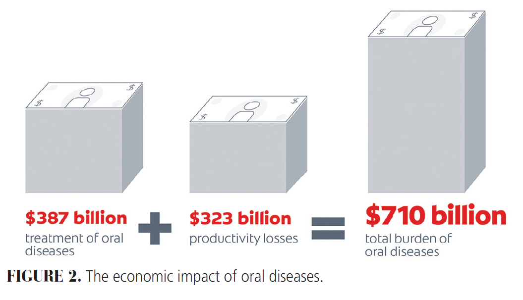 Untreated oral diseases create a considerable economic burden, stemming from both high treatment costs and losses in workforce productivity. In 2019, a representative sample of 194 countries spent $387 billion to treat oral diseases, while losing $323 billion in productivity, a total cost of $710 billion (Figure 2).2 Oral diseases can also impact overall health and well-being, contributing to rising healthcare costs.
