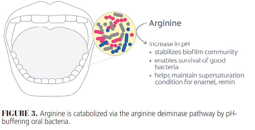 Arginine is an oral prebiotic that increases the pH of biofilms and the oral environment when metabolized by oral bacteria (Figure 3), whereas fluoride acts directly on the tooth surface to strengthen enamel and promote remineralization.5 A naturally occurring semi-essential amino acid, arginine is found in many foods such as meats, dairy products, and even in breast milk.