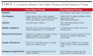 Clear aligners and fixed appliances each have distinct advantages and limitations, making case selection and individual patient needs crucial in treatment planning. As summarized in Table 1, clear aligners offer better esthetics, oral hygiene, and comfort, but are less effective for complex tooth movements and require strict patient compliance. Fixed appliances, on the other hand, provide superior biomechanical control and predictability, especially in complex cases, but are more visible and harder to keep clean. Clinicians need to keep all these factors in mind when deciding on treatment modality type for each orthodontic patient.
