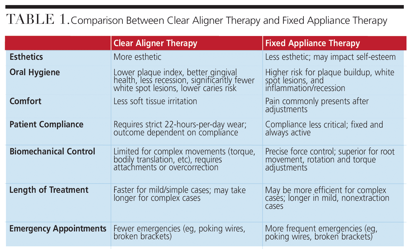 When discussing length of treatment, the answer is not clear whether aligner therapy or traditional braces result in shorter treatment times. However, the literature shows that several factors can account for treatment time discrepancies, which may sway the clinician to prefer one over the other in certain circumstances. One study, for instance, found that clear aligner therapy might lengthen treatment time for complex cases compared to fixed appliances; however, aligner therapy might be able to treat mild, nonextraction cases faster.2 On the other hand, a systematic review by Alam et al9 found that fixed appliances and aligner therapy had comparable overall efficacy in inducing orthodontic tooth movement, but noted a significant reduction in treatment time for aligner therapy.