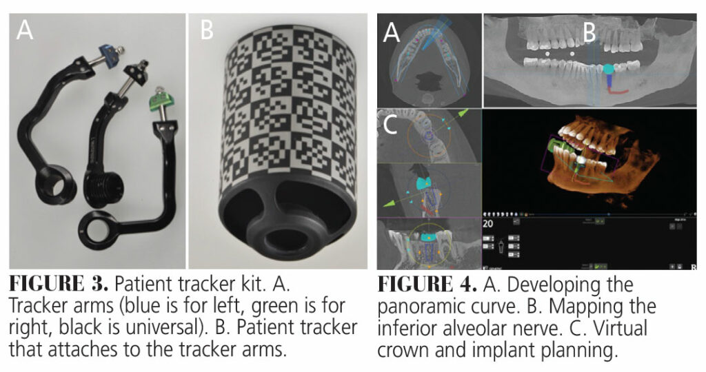 Once an impression is taken, the fiducial is removed and placed in cold water; it is then tried on again in the patient’s mouth to confirm stability and accuracy. The clinician must ensure that whenever the fiducial is taken out, it is placed back into the same location in the patient’s mouth to ensure registration is accurate (Figure 2C). Once the fiducial is confirmed to be stable in the patient’s mouth, the clinician then takes a CBCT of that jaw with the fiducial marker in place (Figure 2D). The fiducial marker has an area to which the tracker arms and the patient tracker attach. This allows for live tracking during the surgery of the patient’s anatomy as displayed in the CBCT (Figure 3).