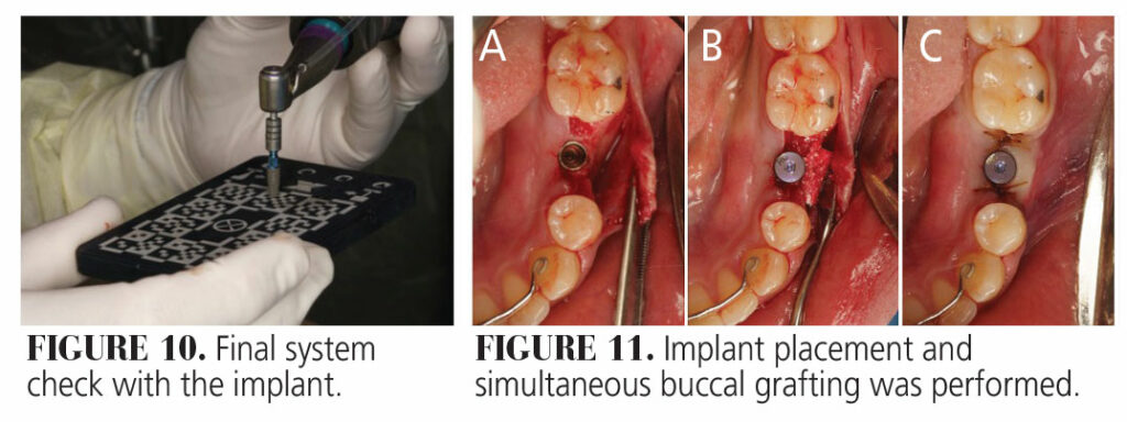 The implant was placed on the handpiece and a final system check was done (Figure 10). The implant was then placed into the prepared osteotomy site. Due to a slight buccal concavity and thin buccal bone, the surgeon opted to graft that site. A healing abutment was placed, and the site was sutured (Figure 11).