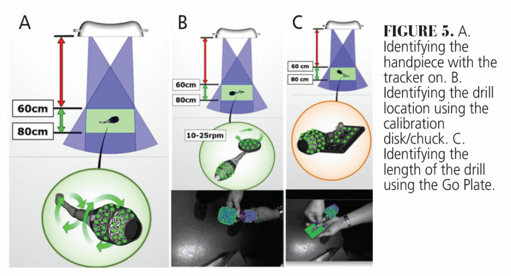 The first step of the handpiece calibration is to hold the assembled handpiece with the tracker on under the camera and rotate it to allow the camera to identify the patterns on the handpiece tracker. This is followed by hooking the calibration disk/chuck onto the implant handpiece head and running the drill motor at 10 to 20 revolutions per minute. This “teaches” the machine the location of the handpiece in relation to the center of the disk/chuck, which is where the drill bit starts. The last step involves placing an implant drill onto the handpiece and allowing it to touch the go plate. This “teaches” the machine to locate the tip of the drill in relation to the handpiece, and hence the length of the drill (Figure 5)
