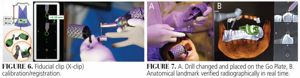 All these steps can be done before the patient’s arrival. Once the patient arrives, before the surgery begins, and after the change of every drill, the clinician must perform a system check. A critical step in the workflow, system checks ensure that the tracking system is working accurately. With every drill change, the clinician places his/her surgical drill on the Go Plate and then touches the drill on distinct clinical landmarks, such as adjacent teeth or bone. If the drill radiographically correlates to the clinical position, then the calibration and registration are correct and the dentist can proceed with the surgery (Figure 7).