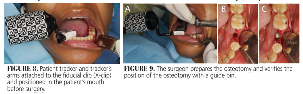 The handpiece tracker was attached to the handpiece and calibrated into the system. A green (right) tracker arm was attached to the X-clip and the patient tracker was screwed on it and a patient tracker calibration was performed. The X-clip was placed back into the patient’s mouth with the tracker attached to it (Figure 8). A full-thickness flap was reflected on the area of interest and a system check was performed prior to implant surgery and with every drill change (Figure 7). After drilling the last drill, a guide pin was placed to verify the location osteotomy (Figure 9).