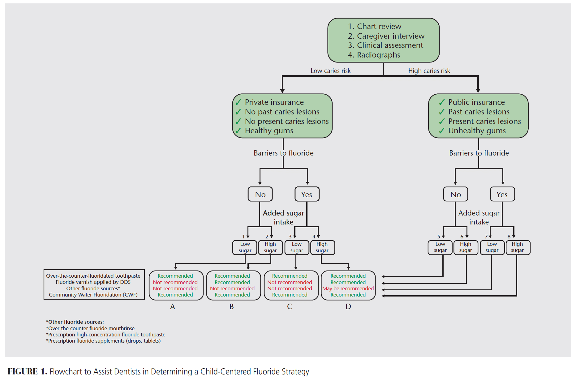 Figure 1 illustrates eight pathways (1 to 8) that lead to four fluoride strategies (A, B, C, and D) based on a child’s caries risk, barriers to fluoride, and added sugar intake. Two common fluoride sources are part of all four fluoride strategies: over-the-counter toothpaste and CWF. These sources provide oral health benefits to all children, regardless of caries risk.17,20 Fluoride toothpastes should be used only after the first tooth has started to erupt into a child’s mouth at around age 6 months.