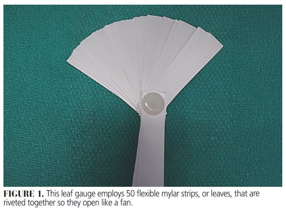In 1973, Long5 introduced leaf gauges to facilitate the separation of posterior teeth to locate CR. A popular brand of leaf gauges employs 50 flexible mylar strips, or leaves, that are riveted together so they can open like a fan (Figure 1). The leaves are approximately 0.1 mm thick, 13 mm wide, 60 mm long, and autoclavable.