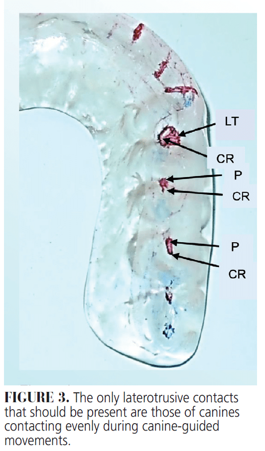 The only laterotrusive contacts that should be present are those of canines contacting evenly during canine-guided movements (Figure 3). No additional adjustments of the guard are needed when one or two leaves will separate the mandibular posterior teeth from the guard when the mandible is in CR.
